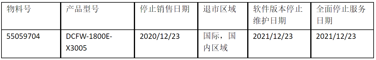 北京购宝钱包官网数码云科信息技术有限公司正式通知您, 以上DCFW-1800E-X3005下一代防火墙(55059704)将于20201223号停止接收新的订单(具体日期见上表),不再供货。给您带来的不便,敬请原谅。